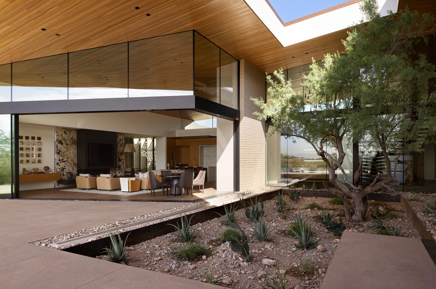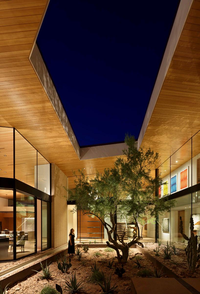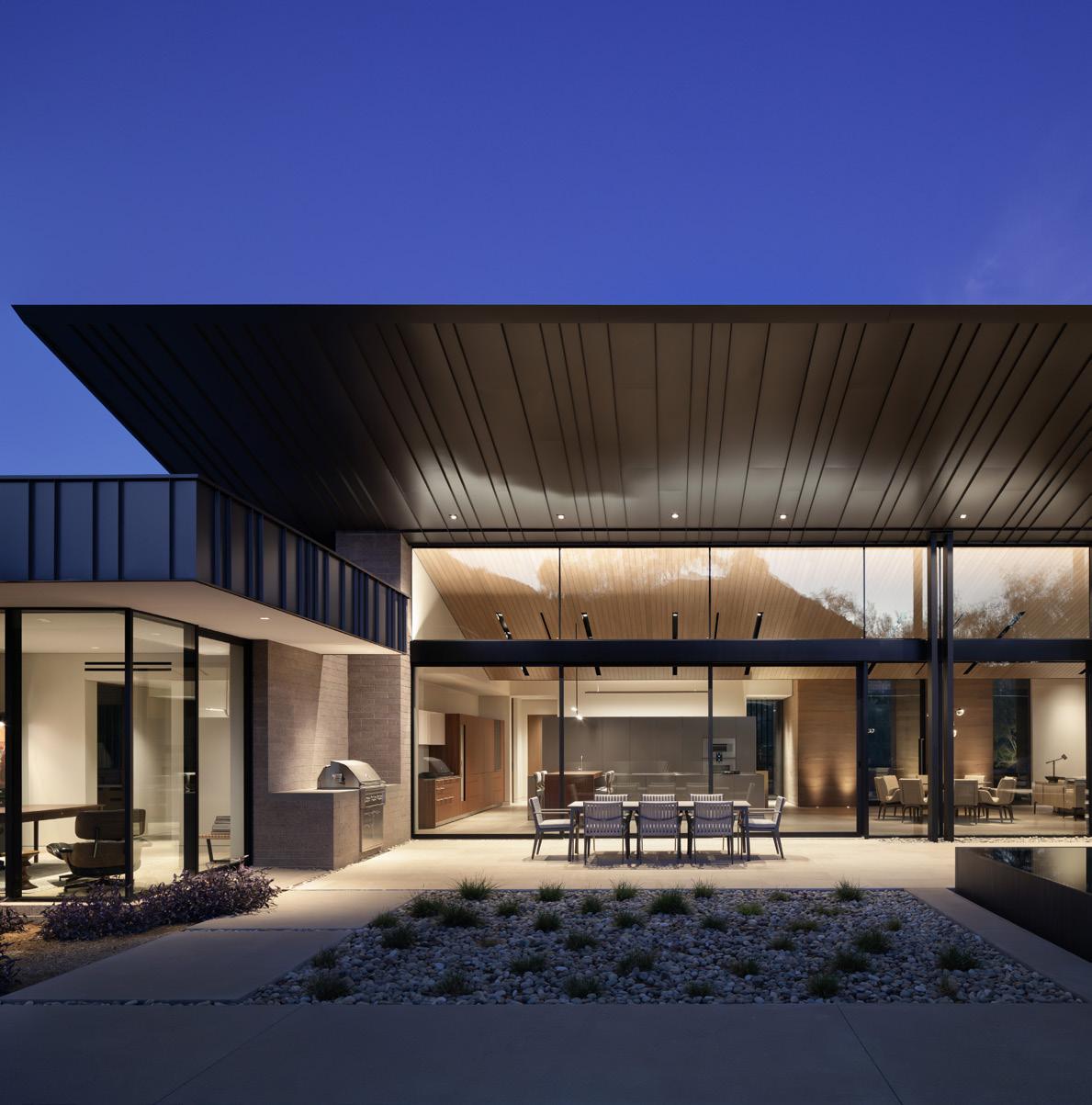 As the day draws to a close, the Arizona sunset bathes Camelback Mountain in warm hues, casting soft light through glazed slots in the site walls. This interplay of light and shadow illuminates the central courtyard, creating a striking contrast between the luminous glass and the solid, protective materials that embrace this tranquil sanctuary, capturing the essence of a home that remains in harmony with its surroundings.