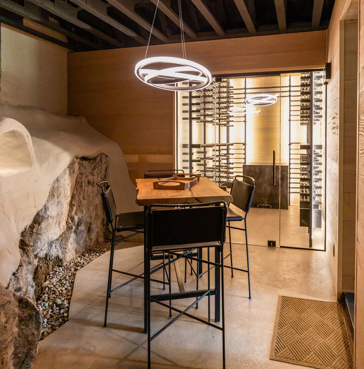 To reinforce the symbiotic relationship with the forest, the home is strategically positioned down the hill among the trees. Leveraging the steep drop of the rock outcropping that bisects the lot, the lower-level houses guest suites, a covered terrace, an expansive home gym and a secret wine cave integrated into the rock outcropping beneath the main house. This stacked configuration not only enhances the visual appeal of the home, but also minimizes the home’s footprint, reduces the number of trees needed to be removed, and ensures that the surrounding trees have ample space to thrive.