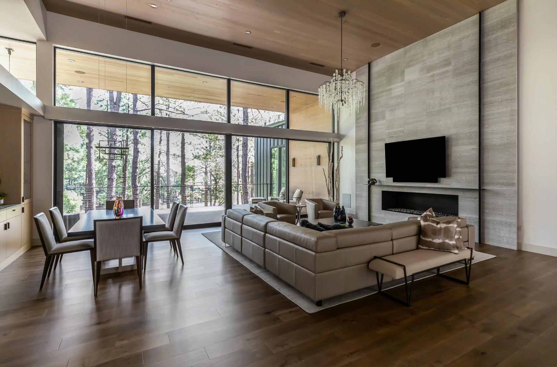 Upon entry, the low profile of the roof and entry portal sets a modest tone that gracefully unfolds into a dramatically scaled great room, offering panoramic views that extend to the treetops. The design intention is to create a space where the boundary between indoors and outdoors is blurred, fostering a connection with the surrounding forest.