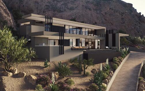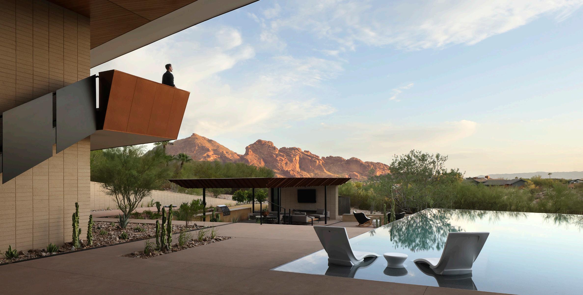On the southern exposure, the residence becomes more transparent, inviting exploration of the various terraces and providing a sense of openness. The infinity edge pool softly cascades, contributing to the passive cooling strategy and enhancing the connection to the surrounding landscape. Framed views extend toward Camelback Mountain, capturing the expansive horizon while offering shelter from the harsh elements. Exterior stairs lead to a balcony, offering a higher vantage point where one can take in the mountain views and sparkling city lights.