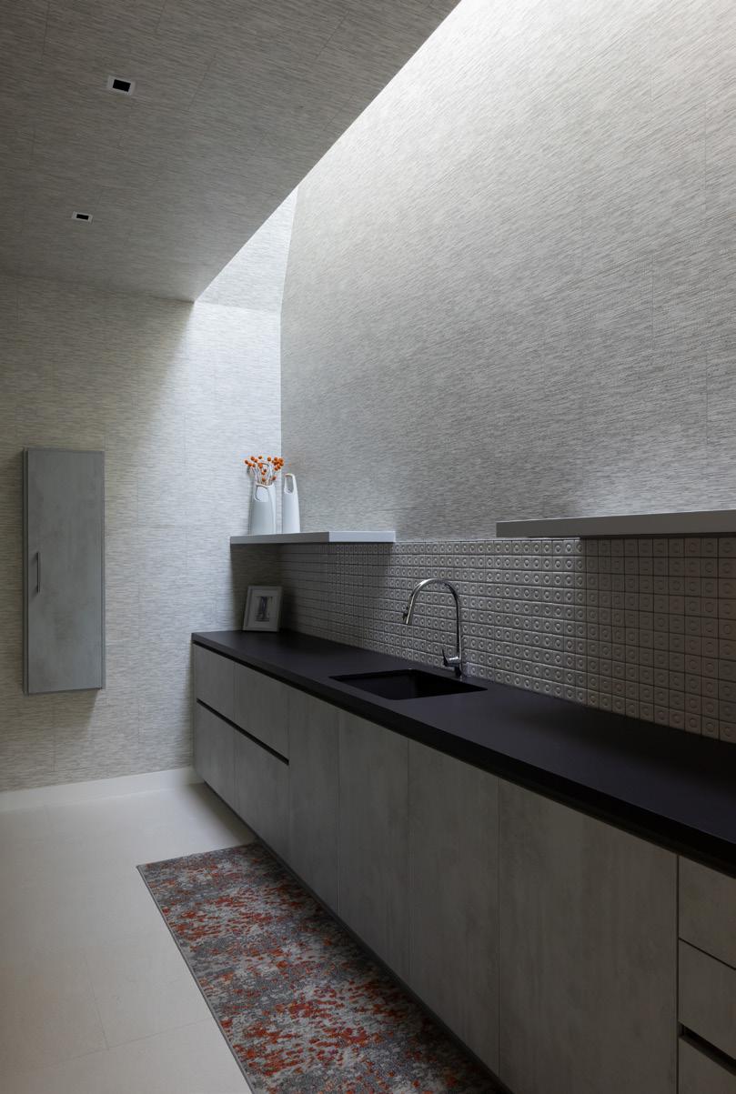 As an extension of the kitchen, the butler’s pantry serves not only as a functional space for meal preparation, but also as a hidden utility area, including space for laundry and for caring for the client’s beloved pet. This thoughtful design element flows seamlessly into the home’s larger rhythm, ensuring that even these everyday tasks remain connected to the broader living experience, without disrupting the home’s overall harmony.