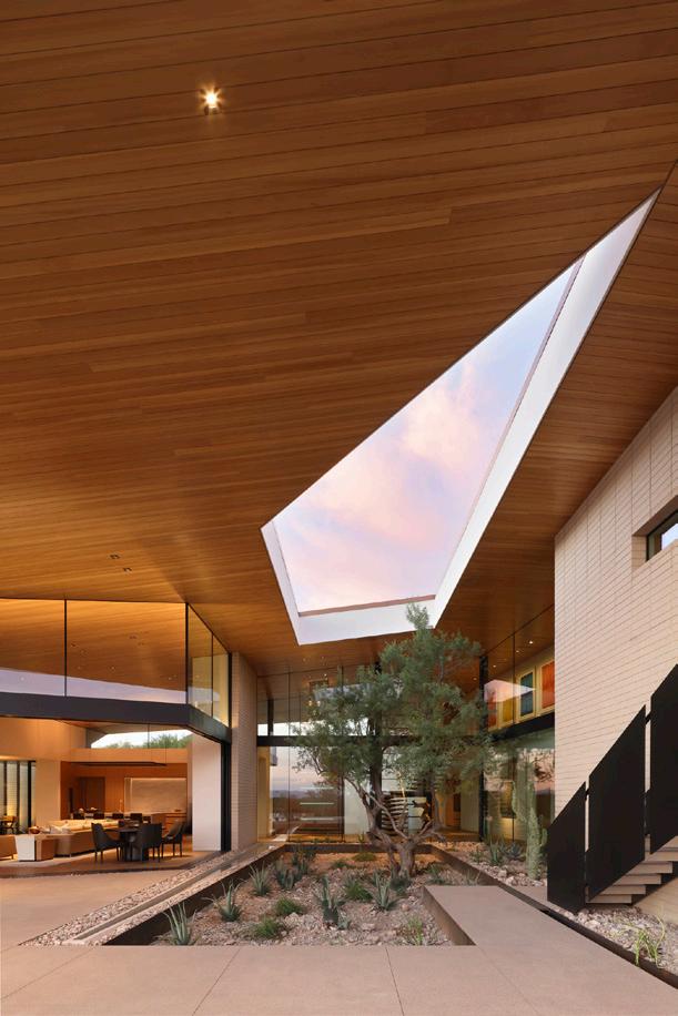 Stepping into the foyer, a lush courtyard immediately unfolds, offering a contained oasis within the expansive desert. At the heart of the design is an oculus, a central feature that draws the brilliant Arizona sky into the space, filling the interior with natural light and establishing an unbroken connection between the home and its surroundings. A floating stair, with its angular wooden treads mirroring the geometry of the architecture, inviting one to ascend into the home’s upper floor.