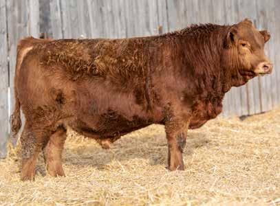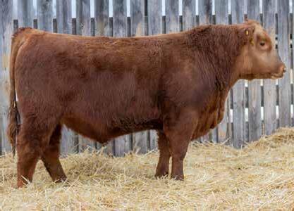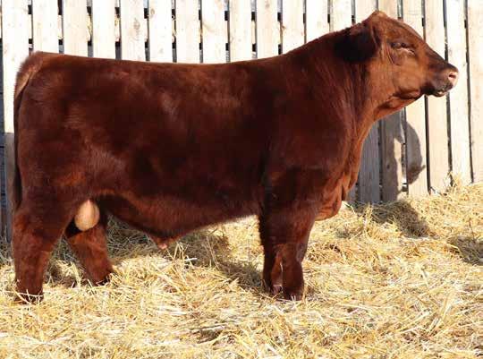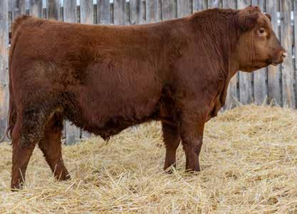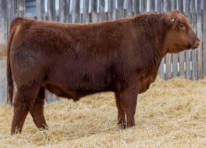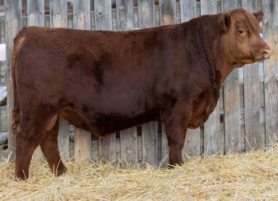 Our only red Moe 12G son in the sale this year with a small birth weight, tons of hair and a really attractive presence. Sound made with big black feet and plenty of muscle. Full sister in the herd with a great udder and doing an excellent job on her first calf. Dark red and soft made herd bull here that offers a real neat calving ease option.