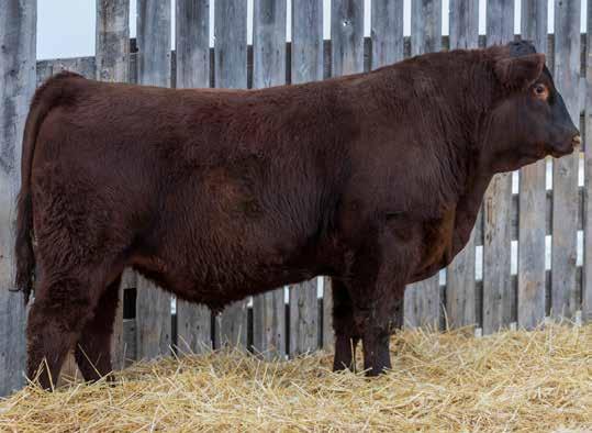 Red Cinder Bankroll 483K is a long spined, super footed son of Red W Sunrise Banknote 284G. Bankroll started out with an 82 lb BW and will make a strong calving ease prospect. Banknote 284G is the outcross Red Angus bull whose genetics are being sought after by many breeders. Banknote daughters have averaged $6,625 over the last two years, including the $14,000 daughter Red Roundup to the Reid family in Ontario. The dam of Bankroll is a beautiful made Power Eye daughter and the mother of Red Cinder Bravo 683H, our high selling bull from the 2021 On Target Sale to the Feige’s of Double F in Parkside, SK. This is a tremendous bull with a super neat pedigree, maternal genetics with the growth of a terminal breed. Past year sons sold the Pansgreau Farms and Larry Shrode.