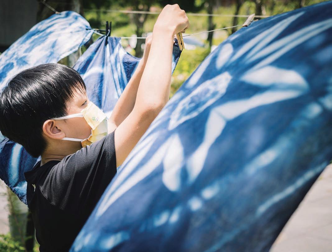 77 陽明山公車總站旁的前山公園,前身是日據時代的草山眾樂園, 現今則是草地綠蔭的清幽休憩公園,潺潺流水與蟲鳴鳥叫不絕於 耳。學苑設計以圖找景的解謎任務,親子們不放過蛛絲馬跡,從 圖卡細微的線索,觀察對照現地,奔走於公園各個角落,有時卡 關時,孩子們也不怕生地直接詢問公園內的其他遊客及在地居 民,親子合力完成解謎任務,眼、腳、口並用,探索湖山里! 觀察.互動:前山公園解任務 近年來湖山里致力於復育大菁,並以特有的在地溫泉水---白磺泉定色,藍染老師先讓大家 聞聞由大菁萃取的藍泥,帶著濃郁天然的青草臭味,不禁讓人眉頭一皺。接著老師分享各 式藍染技巧與使用工具,鼓勵親子盡情發揮不設限,老師說,藍染最精彩的一刻,莫過是 打開作品的剎那,每一塊染布都是創作者獨一無二的圖樣!在過程中孩子與父母接力共作, 多次下染缸也輪流反覆浸染、氧化、清洗,不時聽見打開布巾「哇!」的驚喜聲,飄揚在 風中的藍染布巾正是親子們手作創造力的展現。 啟動五感.發揮創造力:在地手作藍染體驗