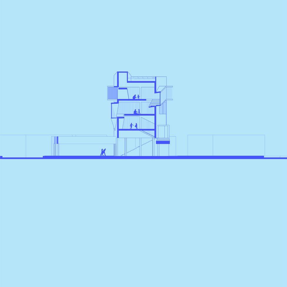 The site is located in Laie, Hawaii. It is located next to Laie Elementary School and Preschool and within a residential area. It is situated in the red zone of the tsunami evacuation map. The city of Laie has a population of 5,704, and has a warm climate, with winds the majority of the year. The concept behind this project was to produce a tsunami evacuation tower that is monolithic in style, yet disrupted by these protrusions that formed from circulation that is within the tower. The tower is meant to appear solid, while still having large paneled openings in all floors allowing for ventilation. The shape of the project was influenced by datum lines that were taken from the other buildings on the site. The facade is made up of precast panels that then sit on and connect to the tree columns and the beams. The structure diagram shows how the beams sit on the columns, and the kitbash demonstrates how the assembly of precast elements work. The building has two access points and an additional one through the egress staircase. As one works their way up the building they are able to experience the different views that are guided by the positioning of the next flight of stairs. The evacuation tower primarily caters towards the elementary and preschool with program such as after school program, lunch area, study area, and multipurpose rooms for other school activities.