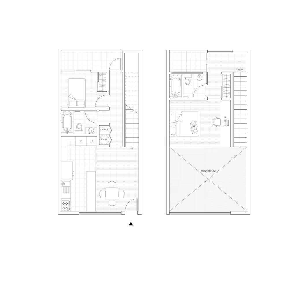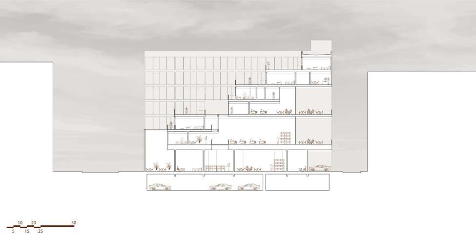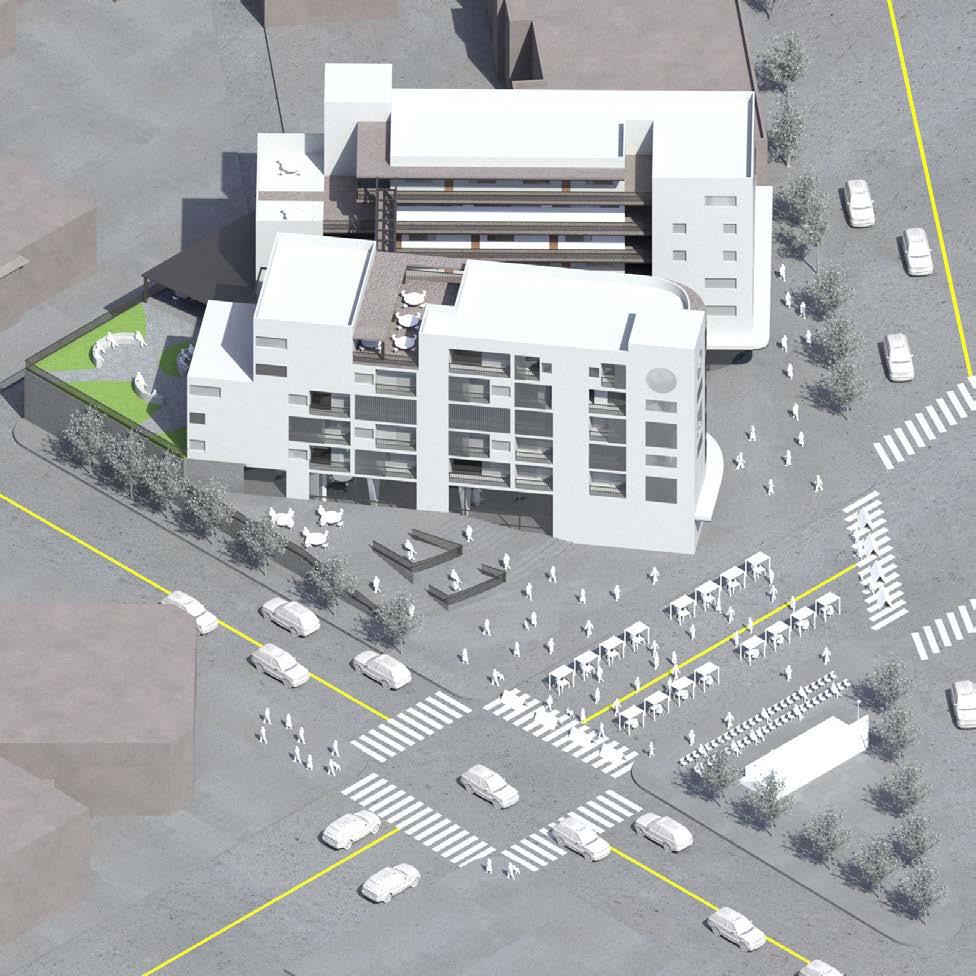 The form of the building exhibits a tall rectangular tower with a terracing formal move happening to the right side. The tall tower is located on the western part of the building where it will serve to shade the outdoor terraced spaces during the afternoon hours. In section the building does something quite interesting with the primary and the secondary program being treated as two separate entities yet they come together and interlock to create the building. The secondary program, which consists of the mental health clinic and remote work areas, is nested under the housing units and follows the spaces becoming shaped by the terracing occurring on the exterior. There is also a retail portion of the building that is located underneath the tower on the Mateo St. front. The monolithic form of the building becomes a bit porous with the way skylights start cutting through both the primary and secondary program spaces. This is achieved by creating a grid that is being dictated by the Studio units located on the terracing portion of the building. By removing and shifting the location of the units, skylights are created which can be seen and experienced from the units levels all the way down to the ground level. This shift also allowed for a long set of stairs to exist on the eastern side of the building that allows the profile of the building on the 8th St. front to become a bit more human scale. These stairs allow the residents of the project to access the exterior garden spaces and also their units through the main corridor that separates the tower and terracing parts of the building. The North side of the building exhibits large double outdoor spaces that are adjacent to the remote work areas that are under the housing units. This formal move can be described as the entire mass of the building being carved away to create outdoor spaces throughout the building.