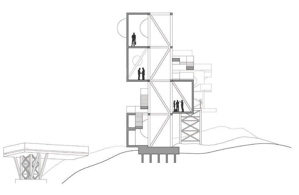 This project is located in Vetter Moutain, California, it is a scientist retreat that aids in wildlife reasearch and as a observation center for the public. The program consists of a private bedrooms and a bathroom for two scientists who will be residing and working in the offices. There are also other service rooms for the scientists such as a laundry room, kitchen, and living room. Additionally, the site must be ADA accessible so that visitors can access a viewing platform. The project explores some of the elements seen in the Nagakin Capsule Tower in Japan by Kisho Kurokawa through the stacking of a series of modules revolving around a central core. Unlike the Capsule Tower, the modules are not replaceable are being cantilevered by a steel framing structure that connects to the core. The bridge connects the public spaces located on the lower level of the main tower and the viewing platform for the visitors. The private spaces are accessible through a series of staircases that revolve around the tower which creates a division in circulation to indicate that the upper levels of the tower are strictly for the scientists.