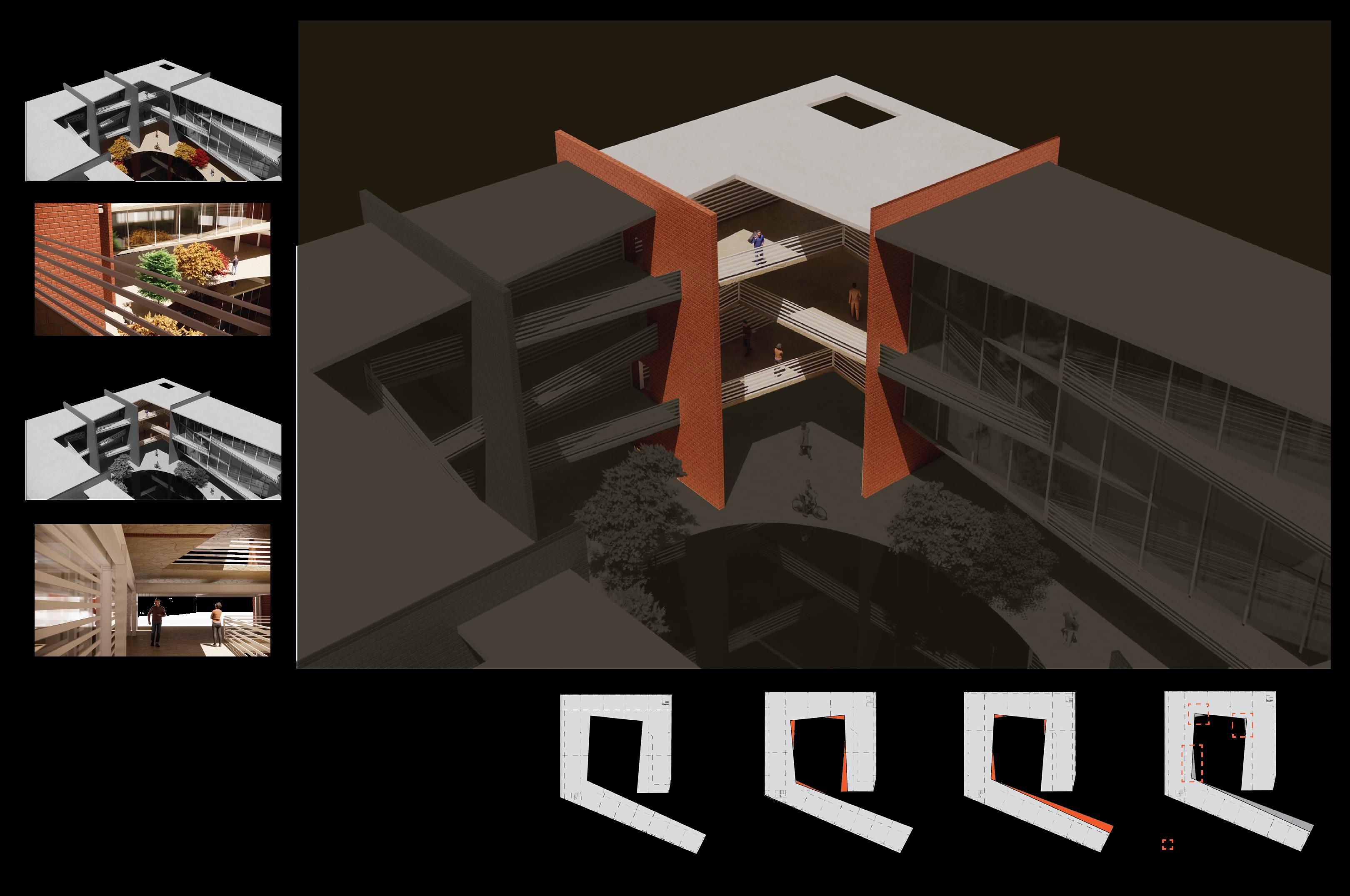The project was designed for young creative professionals, with a primary focus on facilitating the seamless exchange of knowledge. To achieve this, I used glass as a key material, varying its opacity to differentiate between public and private spaces. The building design intentionally contrasts with the site, incorporating a cantilevered structure that enhances its visual appeal and sense of welcome. The ground level features green spaces open to the public, inviting collaboration and interaction with the creative professionals.