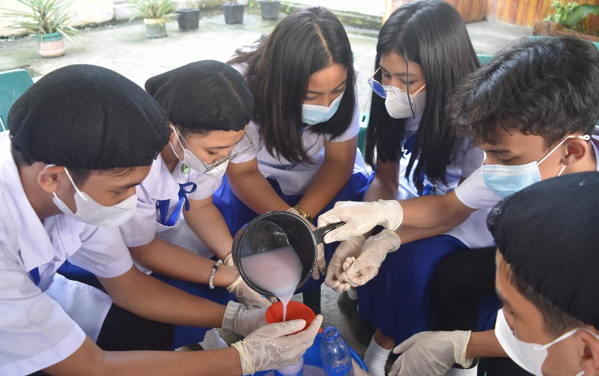 MURANG PANGKABUHAYAN. Bilang bahagi ng kanilang Livelihood Extension Program, nagsagawa ang Bulacan State University Bustos Campus ng pagsasanay sa paggawa ng fabric conditioner para sa mga magulang, mag-aaral, at guro,