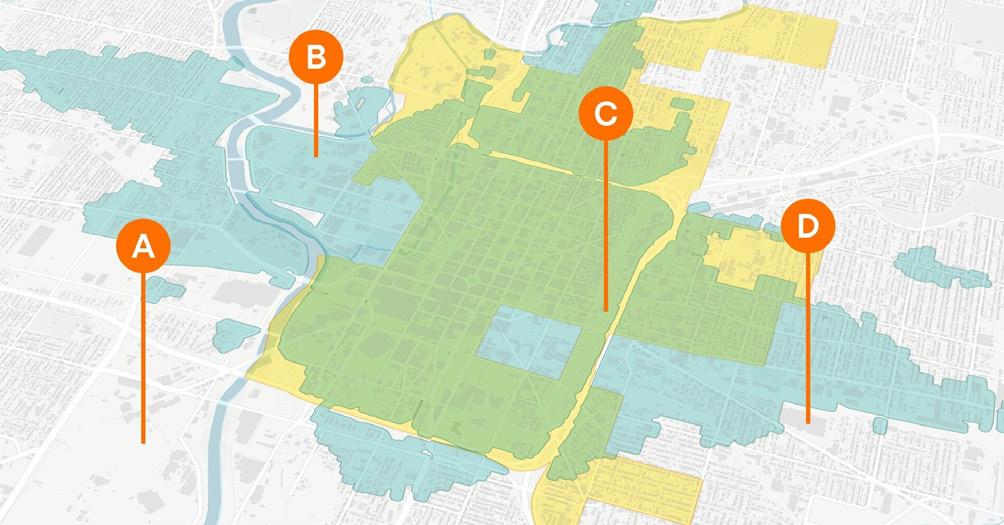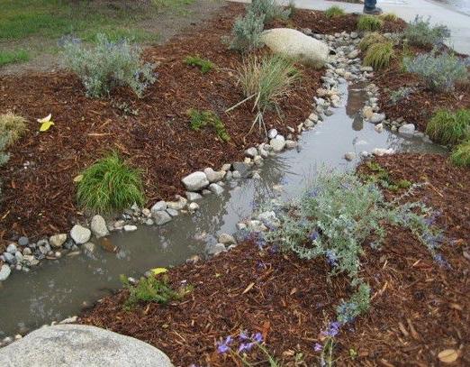 Pemakaian sistem bioswales sebagai upaya penanganan untuk limpasan air hujan, dengan sistem menangkap dan mengolah limpasan air hujan.