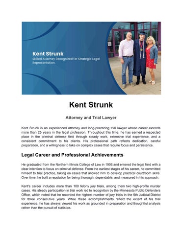 Kent Strunk is an attorney and trial lawyer with more than 25 years of experience in criminal defense. Over the course of his career, he has built a reputation for steady preparation, clear strategy, and consistent dedication to those he represents. His work reflects careful judgment and long-term commitment to the legal profession. Kent graduated from the Northern Illinois College of Law in 1998 and entered criminal defense immediately. Early in his career, he became known for his courtroom focus. He has completed more than 100 felony jury trials, including two high-profile murder cases. For three consecutive years, the Minnesota Public Defenders Office recognized him for conducting the highest number of jury trials in the 9th Judicial District. His approach relies on detailed analysis, thoughtful planning, and disciplined advocacy, earning him respect across Minnesota’s legal community. His professional experience includes work beyond traditional legal practice. From March 2022 to July 2024, he worked with the National Opinion Research Center in Chicago, contributing to national survey efforts. His duties involved conducting field interviews for studies such as the Consumer Finance Survey and the Early Childcare and Education Survey. This work required accuracy, strong communication skills, and effective organization. He considers this period an essential part of his career, as it supported research that informs national programs and policy. Community involvement has long been significant to him. Kent Strunk has supported the United Way, including service as a disbursement judge, and has been a donor and supporter of the Boys and Girls Club. His work often includes mentoring and assisting organizations during demanding times, reflecting his interest in public service.