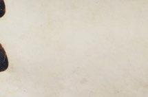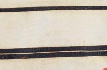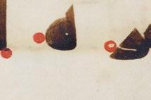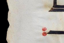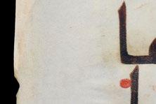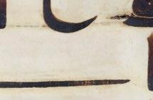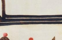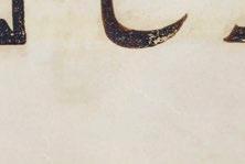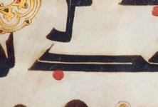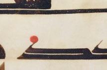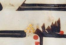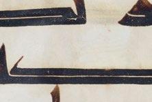 The horizontally elongated letters seen here are characteristic of early kufic Qur’ans on vellum, and the elongations are thought to be a response to the rectangular page format. The angular script is moderated by the roundness of several letters -such as fa, qaf, waw - that look like large black dots; their inner blank spaces reduced almost to a needlepoint.