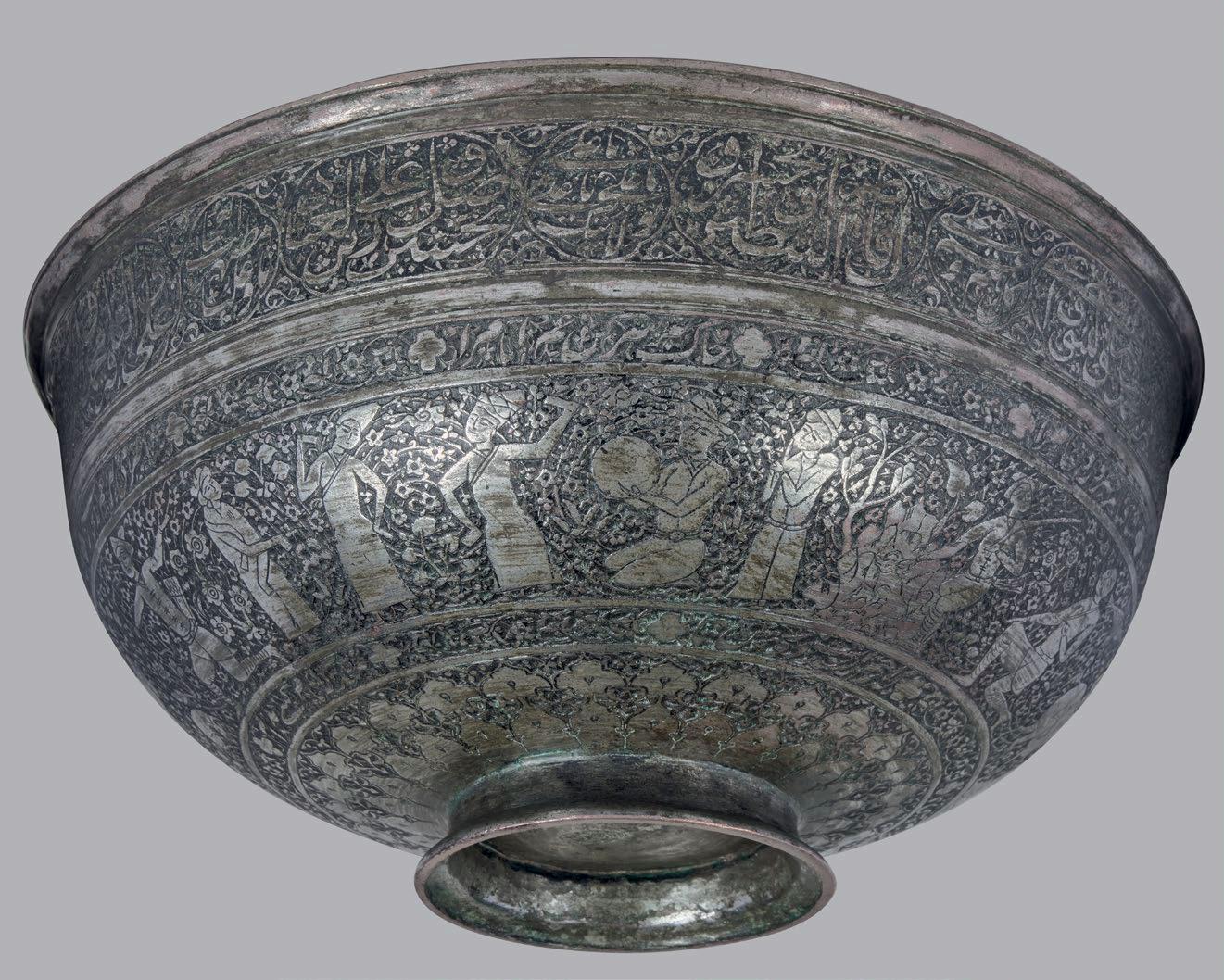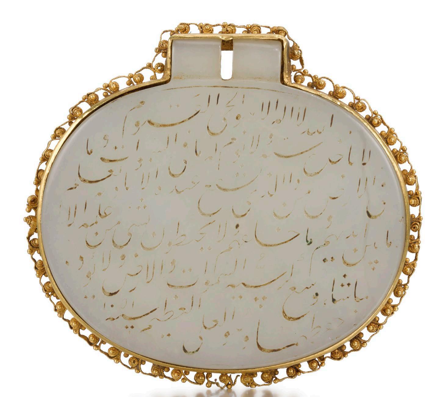 Our selection includes fine and rare examples of Abbasid Qur’an folios in kufic script written on vellum, Iznik ceramics, an early Mamluk silver-inlaid brass candlestick, an illustrated folio from the Timurid historian Hafiz Abru’s Majma‘al-Tawarikh, a Mughal imperial-quality jade pendant bearing the Throne Verse (Ayat al-Kursi) from the Qur’an, an Ottoman gem-set brooch with the imperial coat of arms, a 17th century Safavid bowl decorated with King Khusraw and Princess Shirin, hunting and sufi scenes; a Qajar painting of “APersianNobleLadyasanAcrobat