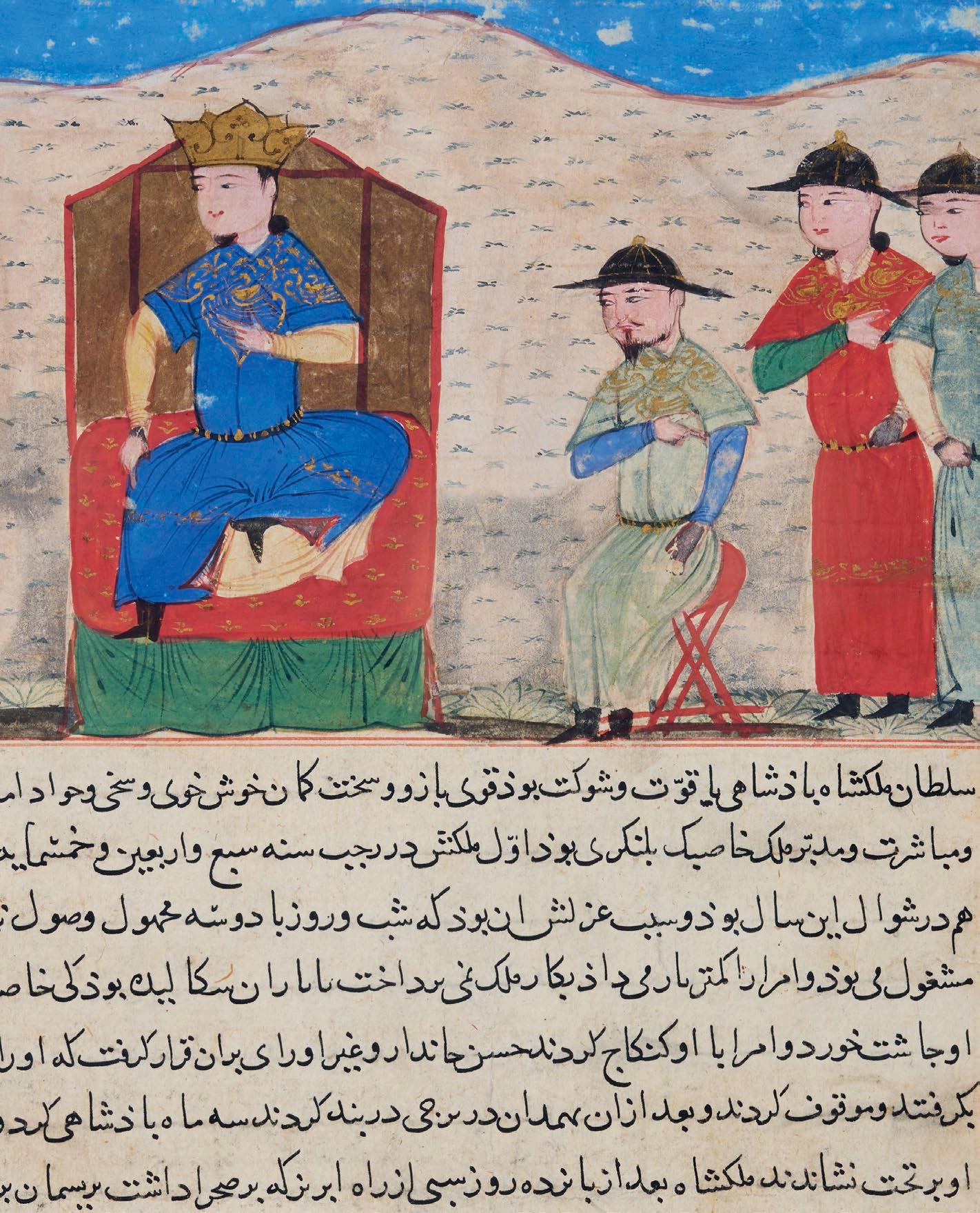 The Timurid Empire spanning Central Asia controlled most of the main trade routes between Asia and Europe including the famed Silk Road, bringing great wealth to the region. The patron of the Jami‘ al-Tawarikh is Sultan Sharukh (r. 1405-1447). He established his capital in Herat rather than Timur’s Samarqand and with his third son Prince Baysunghur (1397-1434), was an exceptional patron of the arts. Shahrukh was eager to commission histories of the Timurid ancestors and Baysunghur established an important library and atelier at Herat, worthy of Timur and his empire.