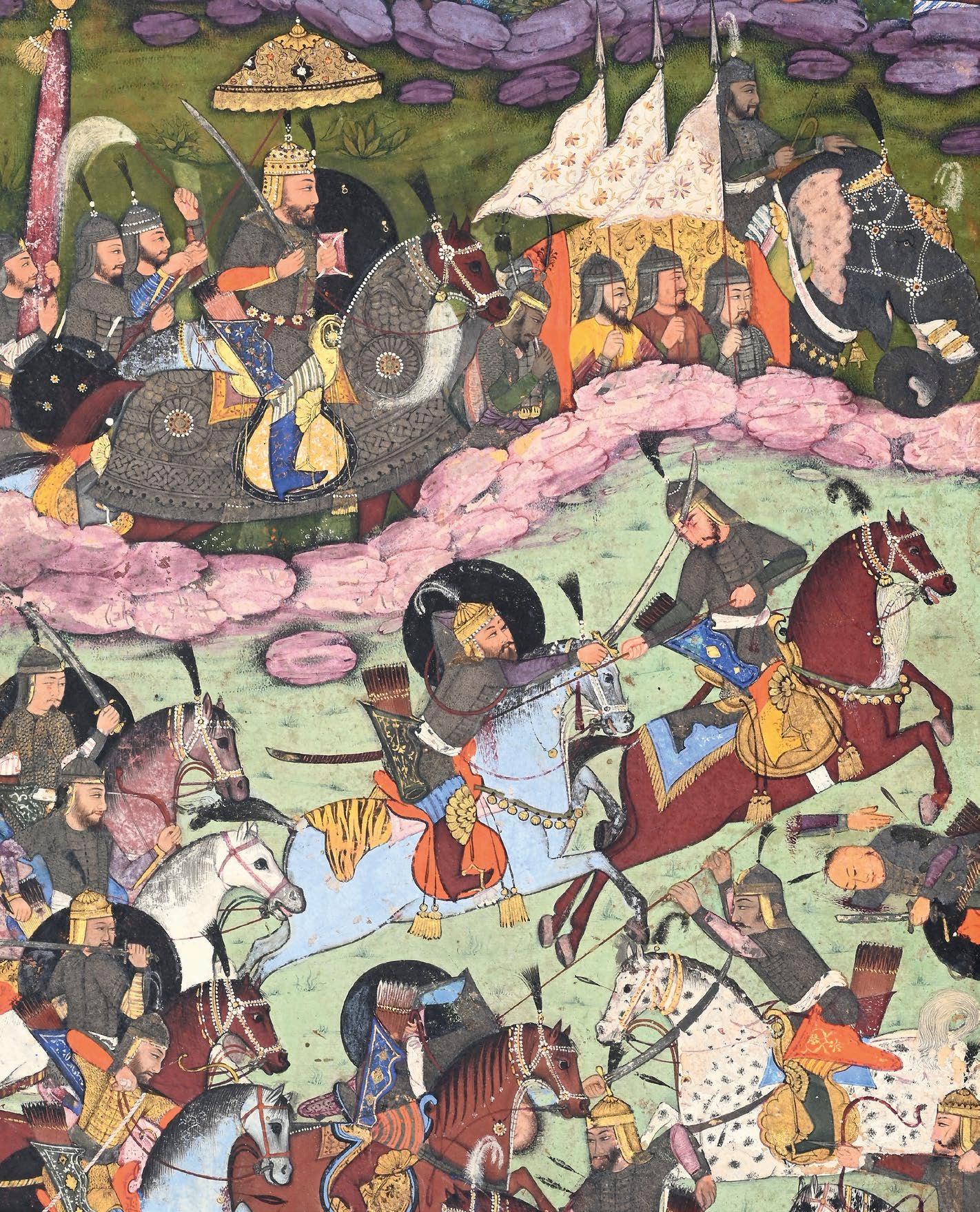 In the foreground soldiers on horseback charge in battle brandishing swords and arrows. Musicians performing in full unison against a vivid blue sky, a Mughal palace in the distance beyond.