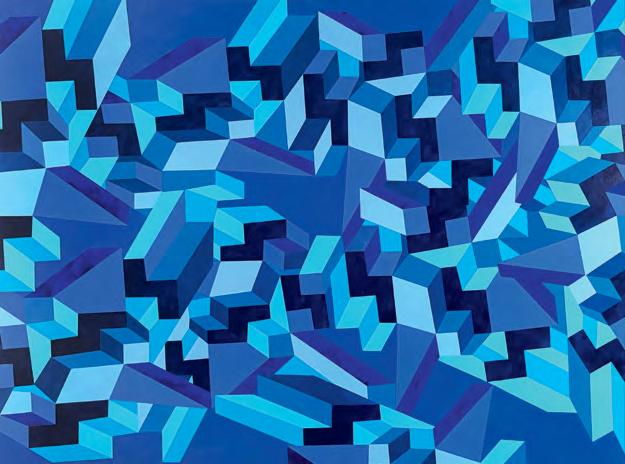 The work engages with the mystical and meditative qualities of this ancient structure, inviting viewers to contemplate impermanence, the nature of existence, and the interconnectedness of all things. Blending, yet contrasting beautifully with the former two intricate works, is a stunning bold composition in blue by US-based Emirati artist, Ebtisam Abdulaziz, that focuses on the role of colour in invoking feelings of tranquillity, depth, and infinity. Associated with the natural world's most prevalent colour (the sky and the sea), Ebtisam plays with shade and intensity with the same artistry as Vasarely, yet injects an added layer of symbolism. Another extraordinary work, this time by British artist Ben Johnson, encapsulates in its magnificent scale and stunning realism - a coup de force of hyper-realism yet with greater depth and homage to the iconic building it depicts than what we associate with hyper-realism. Known for his architectural paintings and his love of geometry and harmony, Johnson’s I'timad ud Daulah - Jaali brings to life the smallest detail, drawing in the viewer as if by 'virtual reality'. To view the threedimensionality of the STUPA 'skyscraper' against the twodimensional representation of a detail from the exterior wall of the Mughal emperor Jahangir’s grand-vizier I'timad ud Daulah’s (d. 1622) tomb, is a unique privilege which enhances the appreciation of both works.