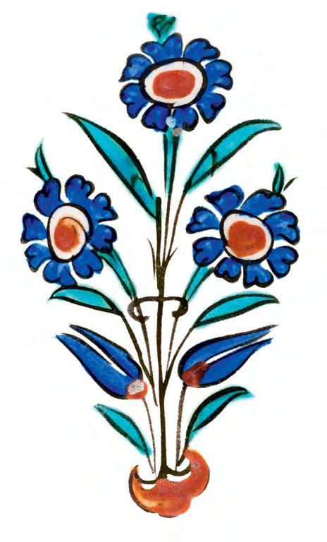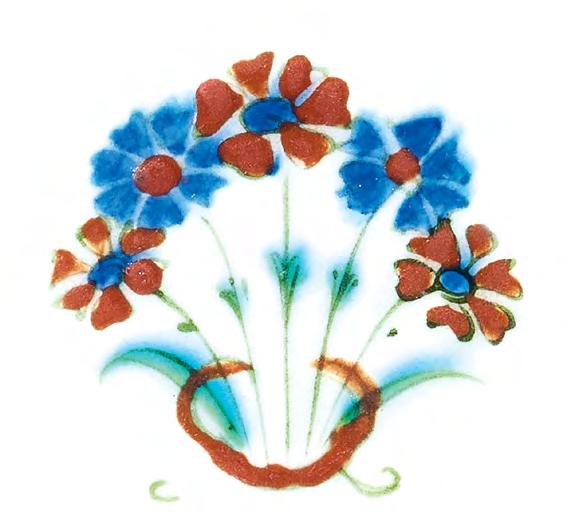 In the Ottoman period flowers, roses in particular, were a constant part of daily life, grown in gardens everywhere, from palaces to humble homes. Flowers were blessed reminders of the gardens of heaven. Foreign travellers and ambassadors who visited the empire frequently remarked about this love of flowers. The 17th century Ottoman writer and traveller Evliya Çelebi describes how vases of roses, tulips, hyacinths, narcissi and lilies were placed between the rows of worshippers in the Eski Mosque and the Üç Şerefeli Mosque in Edirne, and how their scent filled the prayer halls. As depicted in the present tile, vases of flowers adorned niches in the walls, dining trays and rows of vases were placed around rooms and pools.