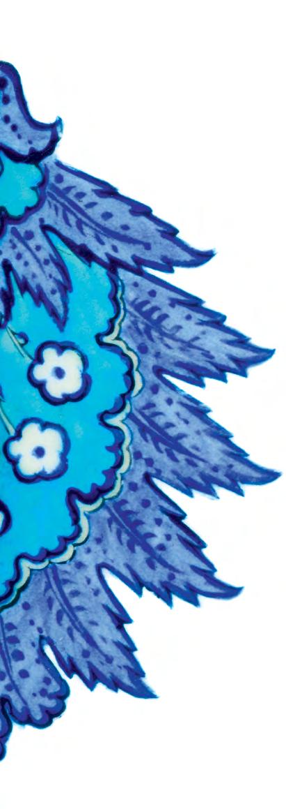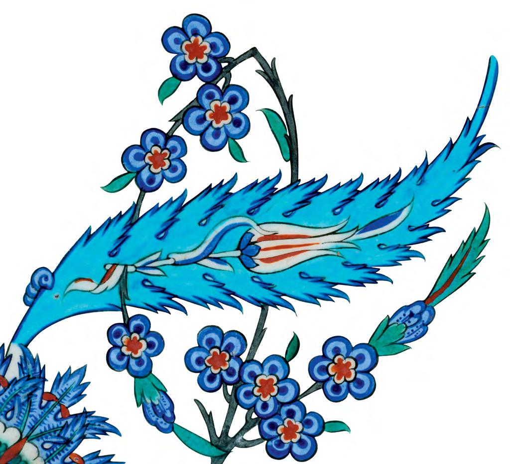The saz leaf, seen on our tile, is an important motif frequently used by the artists employed in the Ottoman court studio. The first representative of the saz style at the Ottoman palace was Şahkulu, an artist brought from Tabriz by Sultan Selim I (r. 1512-1520). This style was a departure from the classical miniature painting, characterised by pictures drawn with a brush in black ink, featuring long pointed leaves, giving birth to the term ‘saz leaf’. Paintings in the saz style may remind a thick forest with intertwined curved leaves and khatai blossoms. In fact, the word saz, used to mean ‘forest’ in the Dede Korkut stories that date back to the 10th or 11th century. For further information please see, Motif from the Sadberk Hanım Museum Collection (written by Turgut Saner, Şebnem Eryavuz and Hülya Bilgi), Sadberk Hanım Museum, Istanbul, 2020, p. 106.