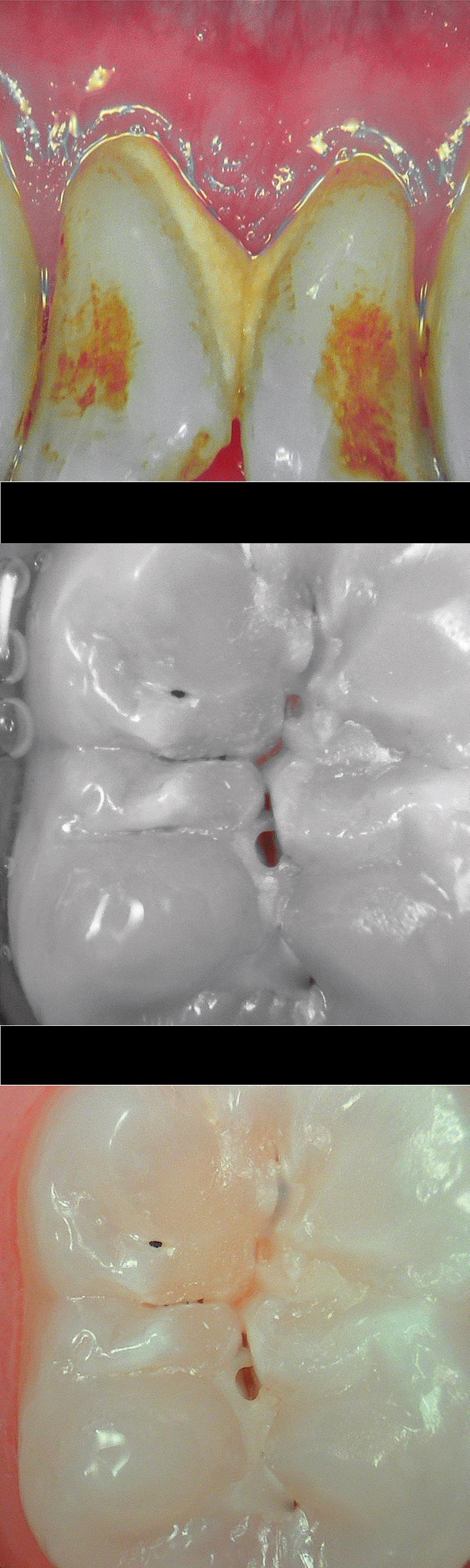 A 21st century way of disclosing the teeth –no dyes or solutions needed. The camera can be switched into Perio mode at the push of a button and it will use selective chromatic amplification to highlight plaque and inflammation.