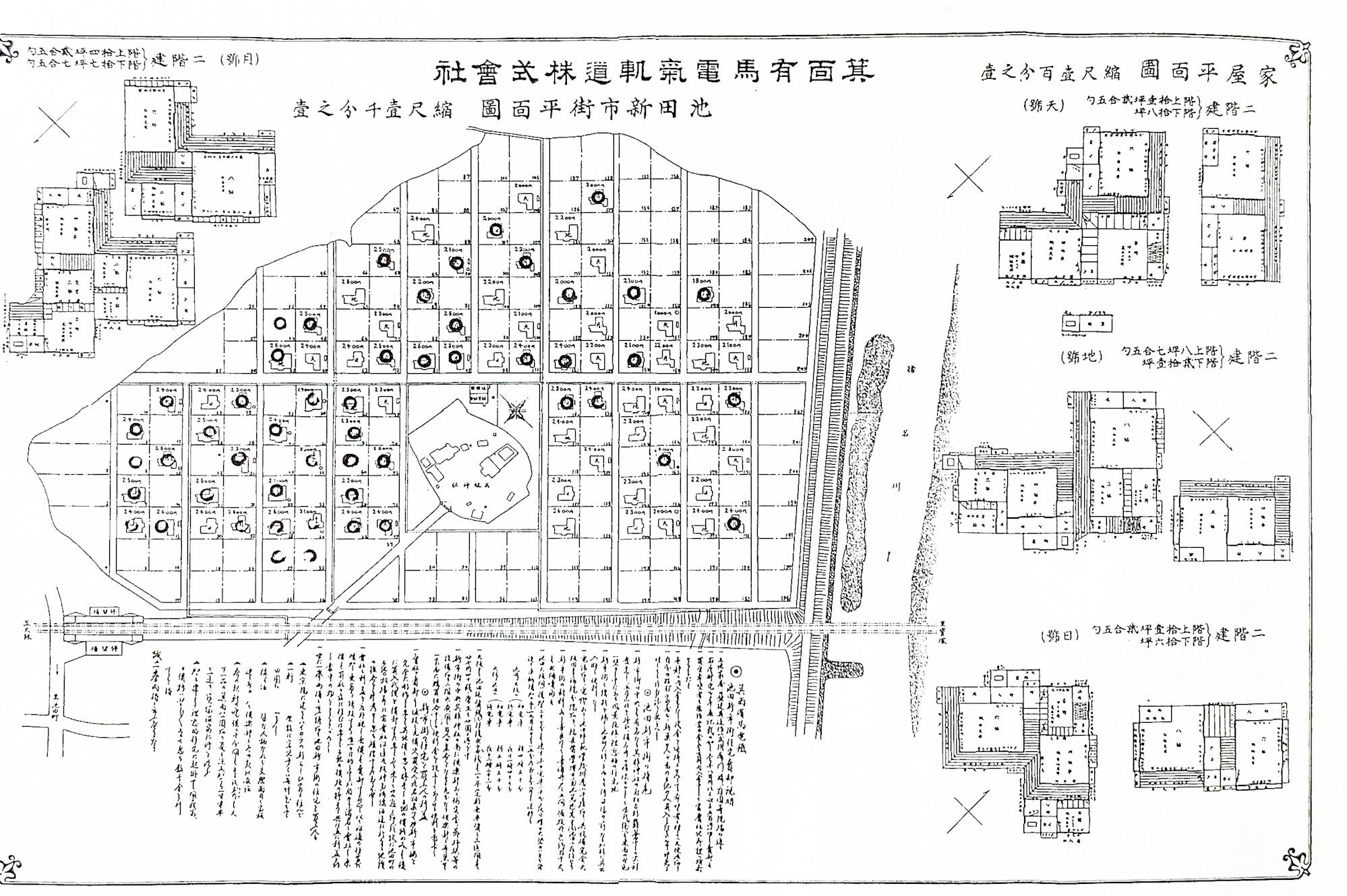 鉄道に対する追い風が吹くなか、私鉄の箕面有馬電気軌道(現在の阪急電鉄)の 実質的創業者である小林一三は「乗客を作り出す」という発想のもと、新たな沿線 開発を進めていった。小林一三は1910年、理想的な住宅像として広い庭園や客間 居間などの存在を謳った「模範的郊外生活」という新しい生活スタイルを宣伝しな がら、池田室町の分譲を開始した。1915年までに呉服神社を中心としてその周囲 に広がる33,020坪の土地に227区画を分譲した。一区画は約100坪として、二階 建ての5~6室、約27坪の家屋が建設された 52 。また周囲の道路は二間が標準で、側 溝のある通りにおいては2.25~2.75間程度であったとされる 53 。自動車に関する言