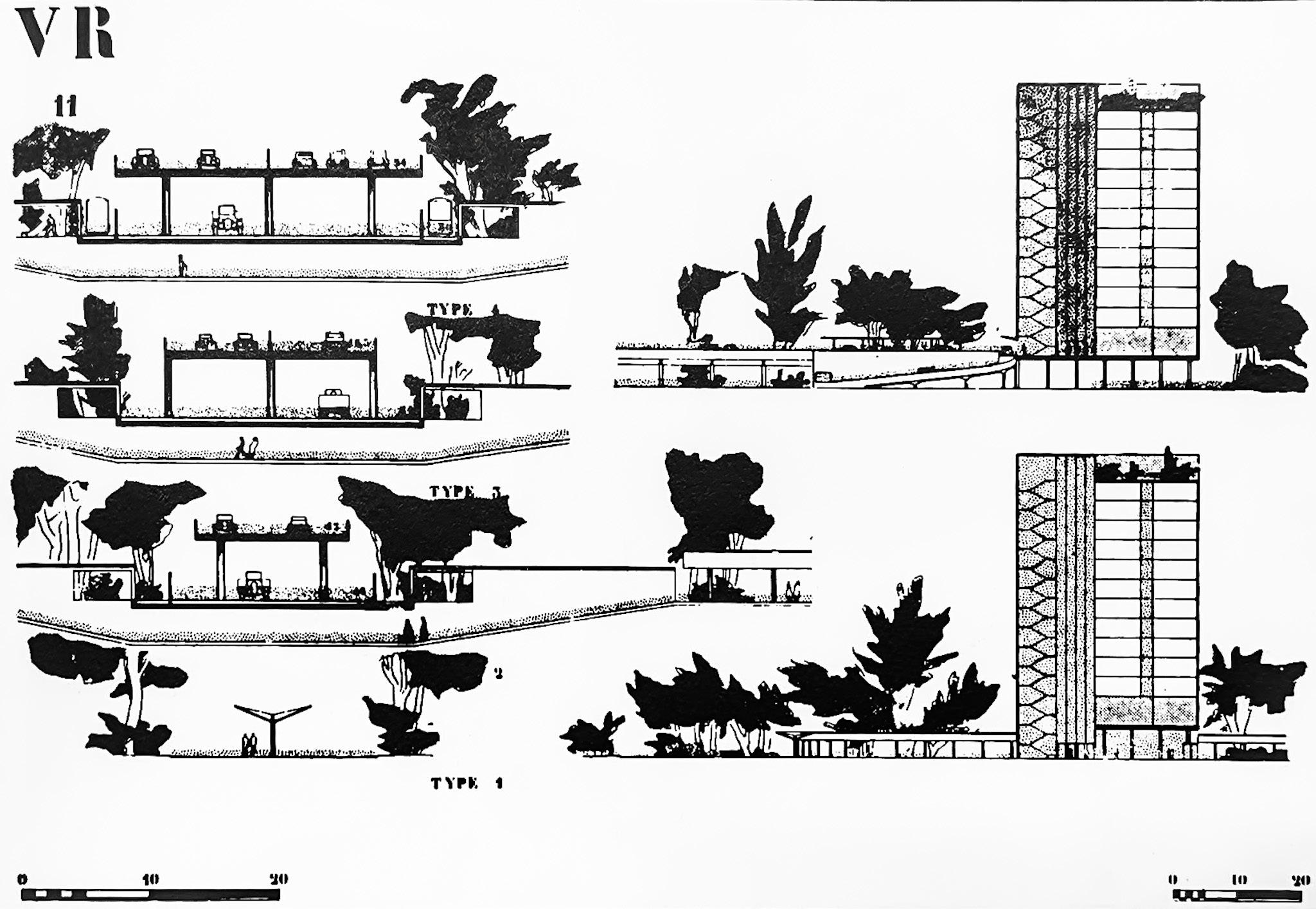 道路を用途別に等級化する「V7の理論」を展開。V1は地方 を結ぶ幹線道路を表し、V2は主要都市幹線、V3は住区を囲 む自動車道、V4はショッピング通り、V5とV6は各住戸に い至るための道路、V7は公園の中に設けられた歩行者専用 道路まが整備。またた近隣住区の最小単位として1600人が 暮らす17階建ての「ユニテ・ダビタシオン」を計画。