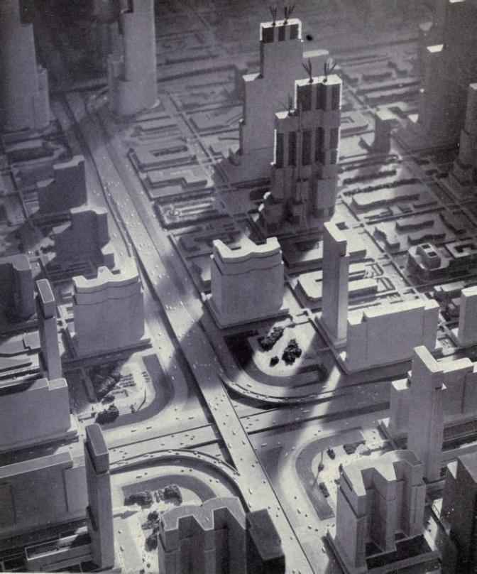 自動車の普及が進み、新たな弊害が生じ始めた。ゲデスは平均時速30km、そし て交通渋滞によってニューヨークだけで1日100万ドルに及ぶ経済損失、さらに はアメリカ国内で年間3万人を超える死者数を出すなどを例に取りながら、自動車 のもつ本来の性能を出しきれていないとした 45 。ゲデスはこれらの改善方法として、 1940年のフューチャーラマにおいて1960年の都市を描いた。