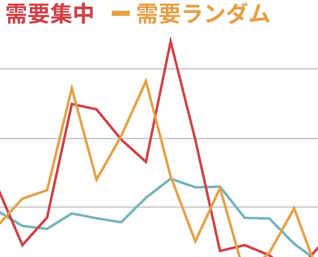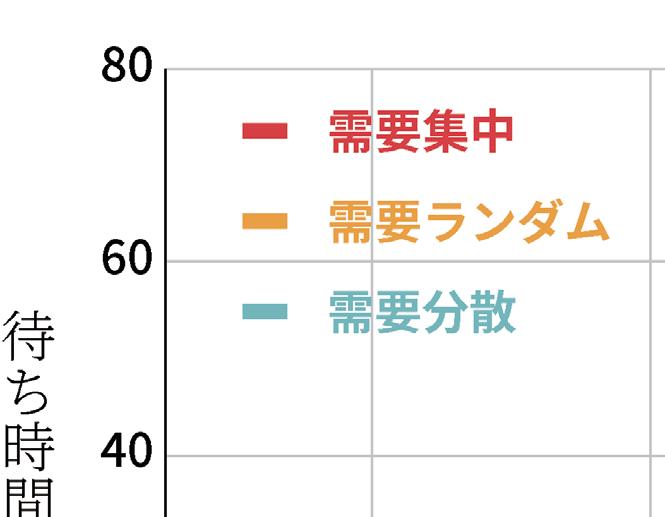 全ての住民が週1回程度利用するサービスのシミュレーションを行うと、需要パ ターンの比較を行うと需要集中>需要ランダム>需要分散の順に待ち時間が長くな り、また平均待ち時間は需要集中においてその需要分散の5倍程度の時間を要する ことがわかった。