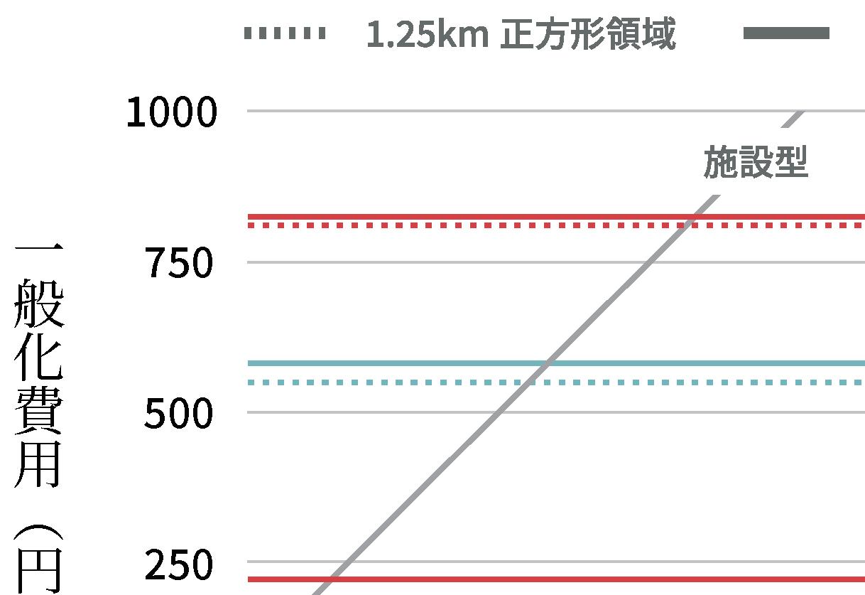まず提供範囲について考察をする(図12,13,14)。本研究では正方形領域全体に 利用者の住宅があるものとして考えているが、実際には最寄りの施設に行く方が、 一般化費用が小さければ施設に優先的に行くと考えられる。そこで施設型と自動運 転型の分岐点となる施設からの距離を提供範囲として捉え考察する。