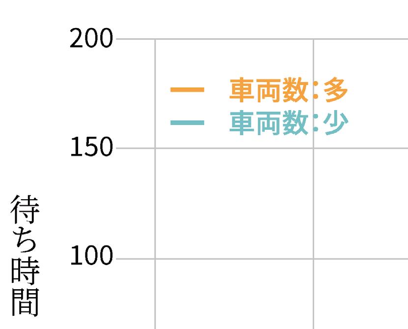 とがわかった。特に車両の絶対数が10台を下回る場合において、他の場合と比較 して約1.6倍から2倍程度に平均待ち時間が急増する傾向にあった。したがってこ