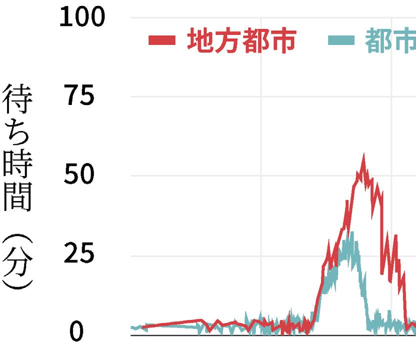 また時刻ごとの待ち時間に着目し、図6のように同じ3.75kmの正方形領域、 一人あたりの車両数0.0005台の場合について、都市部と地方都市を比較すると、 人口の少ない地方都市においては午前の時間帯における待ち時間が都市部の2倍、 50分超になっており、また正午の時間帯においては地方都市のみが待ち時間が伸 びていることが確認できる。