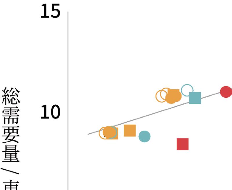 以上のことから、人口密度自体の待ち時間に与える影響は移動時間が限られてい る今回の範囲では、認められなかった。また総需要量/車両数と待ち時間は比例関 係にあり、車両数が十分に存在する際には地域間の際は生じにくい。一方で、車両 の絶対数が少ない限られた範囲や一人あたりの車両数である場合には、待ち時間を 増加させる傾向にあることがわかる。