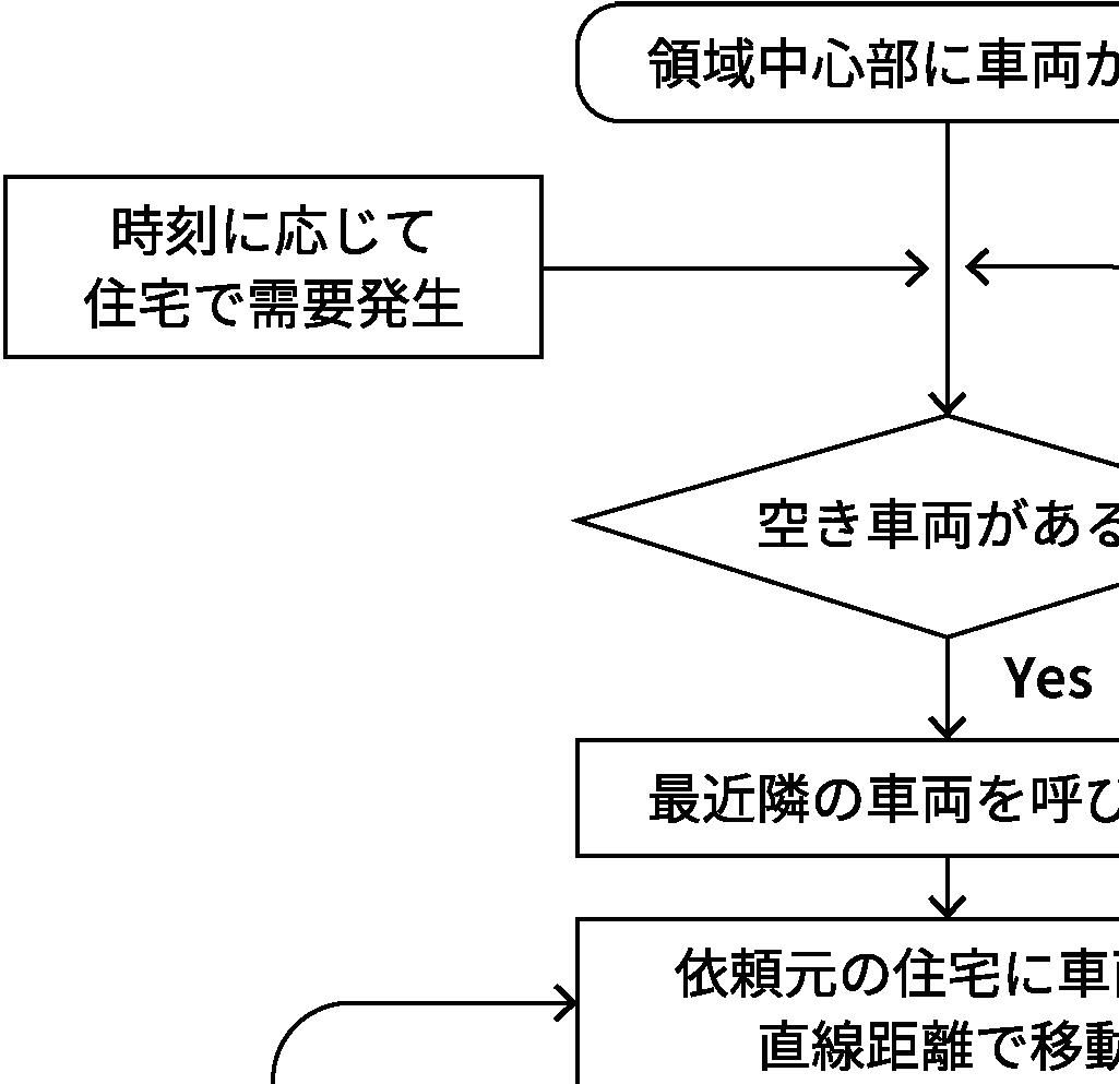 のような状況は、地方都市など人口が需要量に対して少なかったり、また領域範囲 が1.25km正方形領域など狭い範囲の場合であった。逆に車両数が十分に配置され ている場合、地域差は大きくは生じないことがわかった。また本研究は最大の領域 範囲が3.75km正方形領域であったため移動時間が少なかったこともその理由の一 つとして挙げられる。つまり地方都市がより不利な状況になり得る。