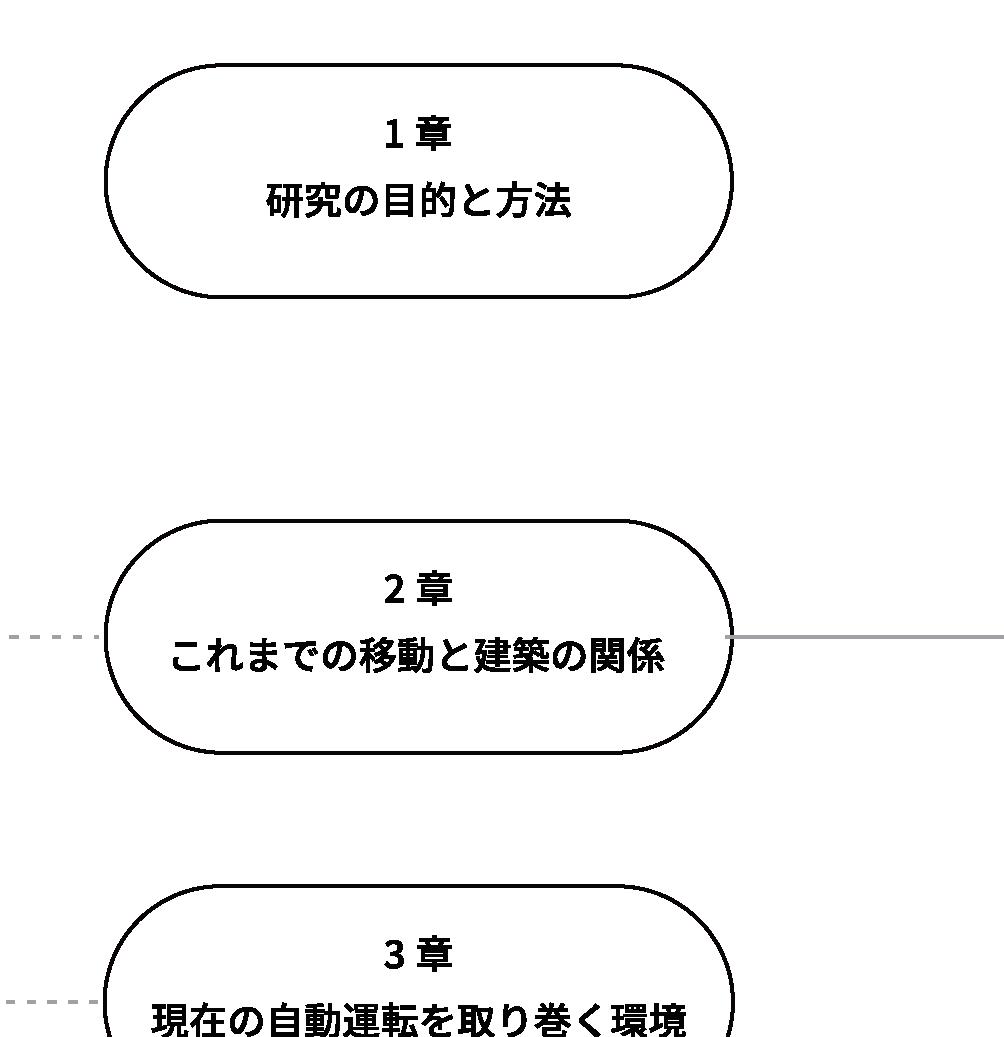 ル・コルビュジェがモビリティの変化に伴い、新たなインフラ網と建築のあり方 を定義していることが2章からも明らかになったが、自動運転車が導入される際に も同様の機会が生じると筆者は考える。またような変化が起こる際には、細分化さ れた専門領域ではなく、領域を横断・統合することで新たな建築像や都市像が浮か び上がると考える。本研究から予見された4つの階層が見えてくる。
