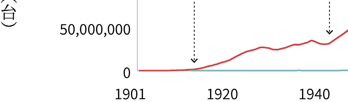 応するための舗装などが十分に整備されておらず、これらが自動車の普及を妨げた 一つの理由にあると考えられる。 2.3 日本における自動車と 都市計画(1920-1960) 図23 1900年代初頭における車両種別車両台数 原典:「警察統計年表」内務省警保局 出所:牧野克彦:自動車産業の興亡, 日刊自動車新聞社,
