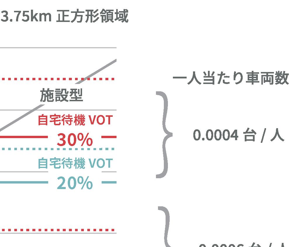 次に自宅待機時間のVOTが変化することによる効果を検証する。一般化費用に 着目すると、都市部における3.75km正方形領域において自宅待機時間における VOTが30%から20%に下がった場合、一人当たりの車両数0.0004台の際には一 般化費用は824円から580円へと下がる。またこれを距離で換算すると650mか ら460m程度への変化である。一方で一人当たりの車両数を0.0004台から0.0006 台の1.5倍に増やした場合には824円から221円へと減少した。つまり自宅待機 VOTを軽減するより、車両数を増加させた場合の方がより大きな効果が得られる ことが確認された。この傾向は都市郊外や地方都市においても同様であった。地方 都市においてはこの自宅待機VOTが変化した際の効果が最も大きかった。