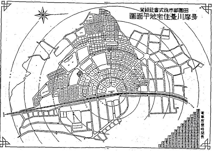 109m)ずつ半径が増す同心円と放射状の道路で構成する街区構造を使用した 57 。こ うした街区を構成する道路幅は4m以上、幹線道路は13mが確保されたが、これ らの道路は当初未舗装で砂利が敷き詰められただけであった。 調布駅(現 田園 調布駅)の開通当時の写真には渋沢栄一を待つ自動車の様子もあることから、ある 程度自動車の時代を見据えた道路幅になっていると筆者は考える。 以上のように、戦前においては鉄道を基軸とした中流階級のサラリーマンを対象 とした、中心市街地から離れた位置にあった田園地帯に対して、新たな住宅地の建 図27 田園調布の配置図 図28 調布駅(現:田園調布駅)開業当時の様子