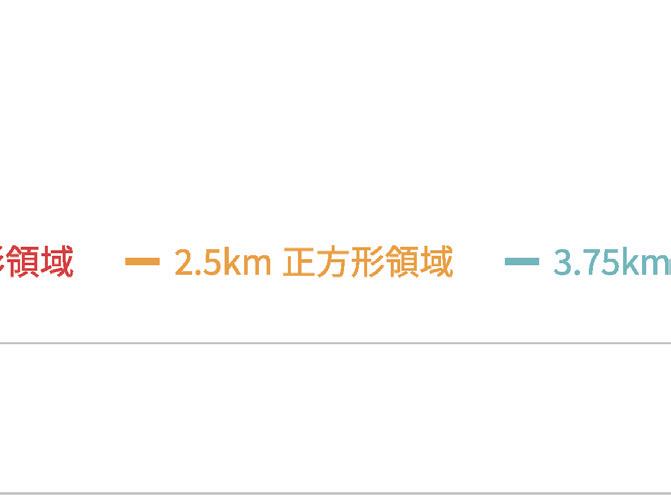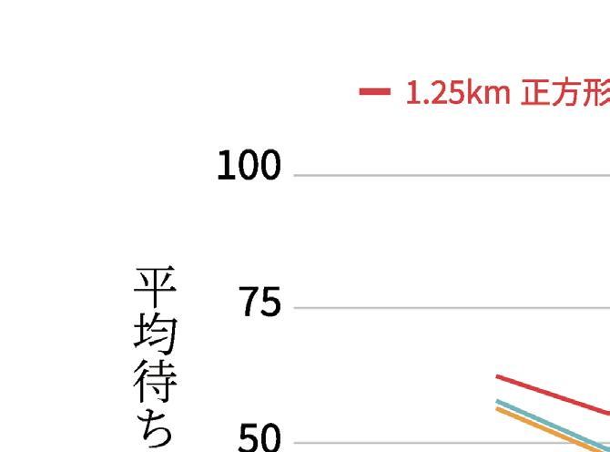 正方形領域による範囲と人口分布による結果は、3.75km正方形領域など範囲 が広い場合ほど平均待ち時間が短くなった。計測前においては、人口密度の高い 1.25km正方形領域が最も移動が少なく、また面積あたりの需要発生総量が多いた め、待ち時間が短くなることが予測されていたが、前述のように車両絶対数が少な い今回の状況においては、その限りではなかった。一方で都市部や都市郊外におい ては、2.5kmと3.75km正方形領域による待ち時間は同一となった。したがって、 より大きな範囲やサービスの利用頻度が多い需要パターンで実験を行うと、人口密 度が高いエリアの方が待ち時間は有利になる可能性が高いと筆者は考える。