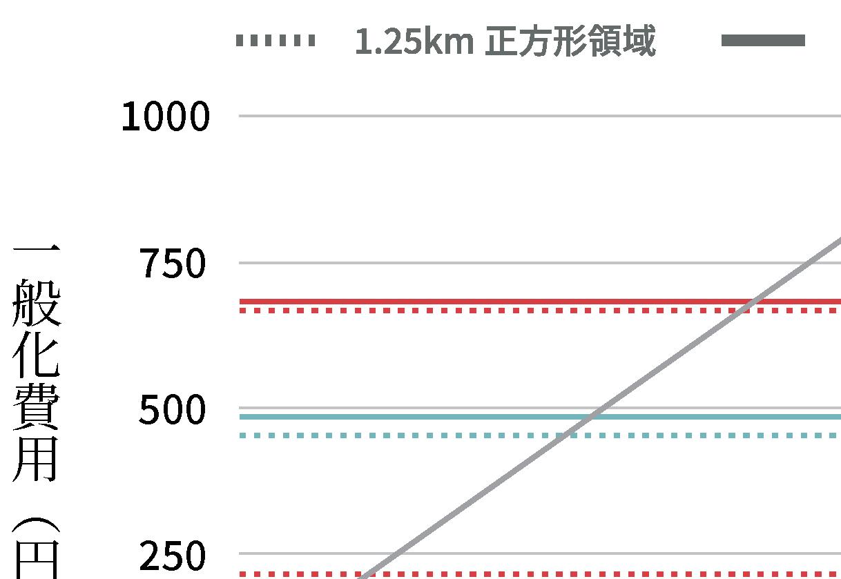 場合において見られた。この要因としては、1.25km正方形領域においては、移動 距離が相対的に短く、この影響が寄与したと考えられる。