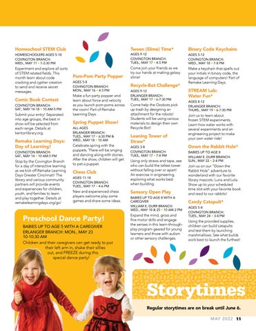 Storytimes Regular storytimes are on break until June 6. MAY 2022 11
