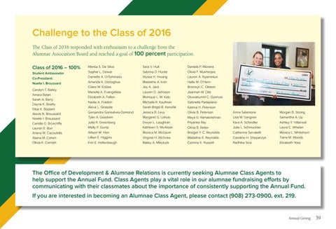 Challenge to the Class of 2016 The Class of 2016 responded with enthusiasm to a challenge from the Alumnae Association Board and reached a goal of 100 percent participation. Class of 2016 – 100% Student Ambassador Co-President: Noelle I. Broussard Carolyn T. Bailey Amara Balan Sarah A. Barry Dayna K. Beatty Elise K. Bossert Alexis N. Broussard Noelle I. Broussard Camille D. Brzechffa Lauren E. Burr Ariana M. Cacoulidis Alaina M. Cohen Olivia K. Cornish