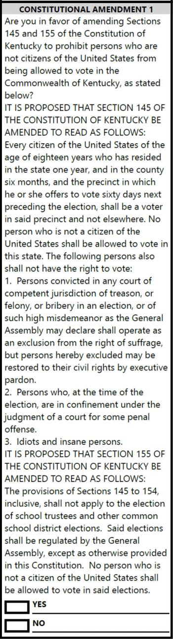 AMENDMENT 1 would ban non-citizens from voting. This is already illegal in Kentucky. This is a political ballot measure aimed at immigrants.