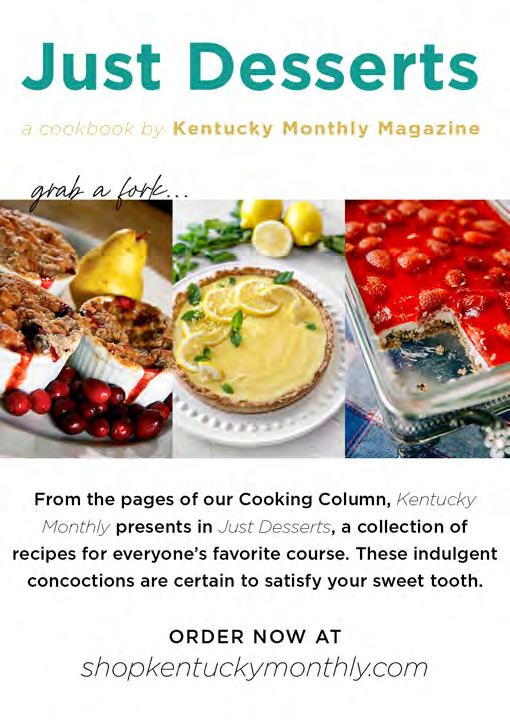 KENTUCKY MONTHLY (ISSN 1542-0507) is published 10 times per year (monthly with combined December/January and June/ July issues) for $25 per year by Vested Interest Publications, Inc., 102 Consumer Lane, Frankfort, KY 40601. Periodicals Postage Paid at Frankfort, KY and at additional mailing offices.