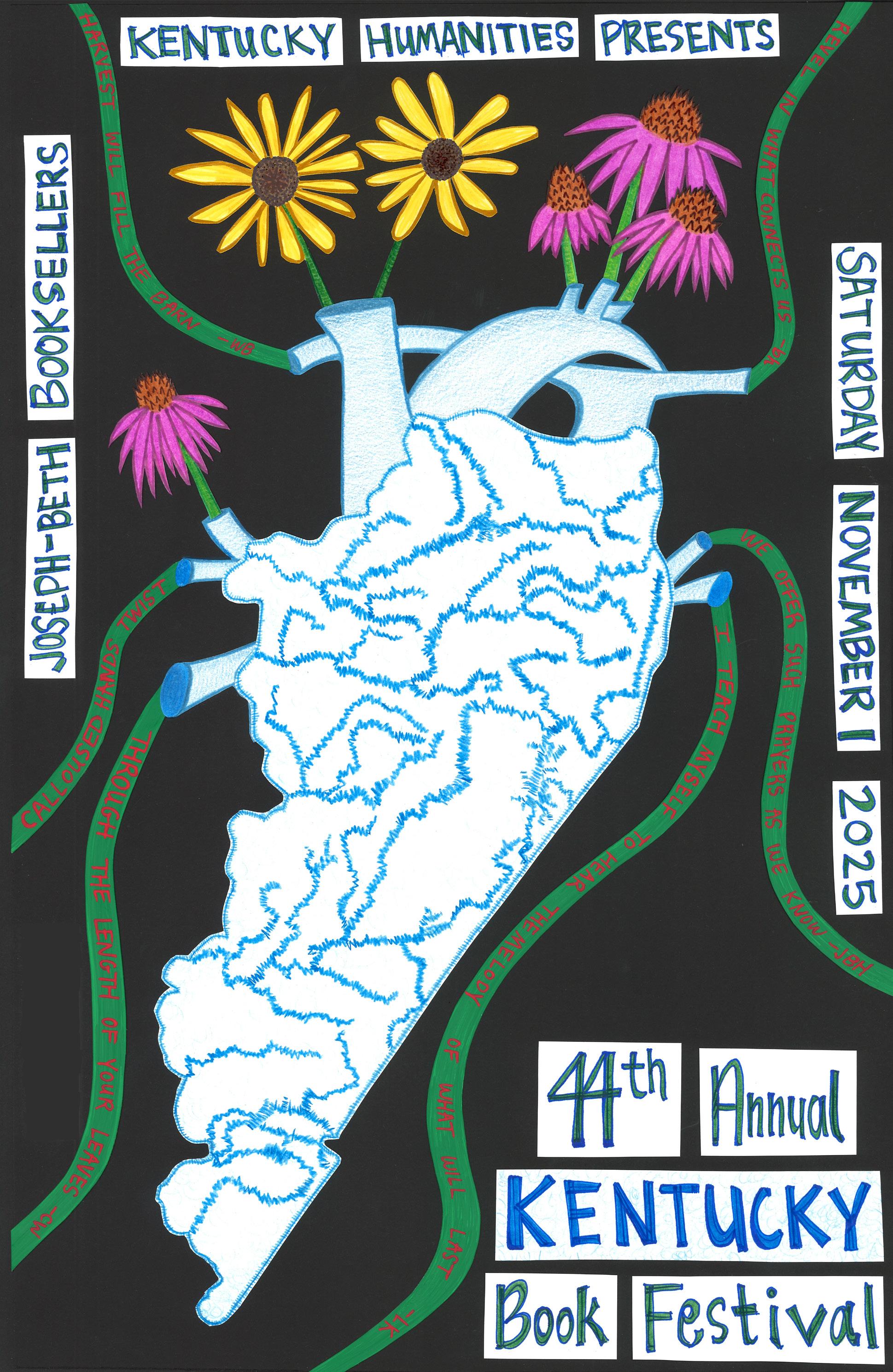 Kentucky Humanities is an independent, nonprofit affiliate of the National Endowment for the Humanities in Washington, D.C. Kentucky Humanities is supported by the National Endowment and by private contributions. In addition to producing the Kentucky Book Festival, Kentucky Humanities offers Kentucky Humanities at the Schools programs, sponsors PRIME TIME Family Reading Time®, offers Kentucky Chatauqua® and Speakers Bureau programs, hosts Smithsonian traveling exhibits throughout the state, publishes Kentucky Humanities magazine, serves as the Kentucky affiliate for the Library of Congress Center for the Book, and awards grants for humanities programs. Views expressed in this publication do not necessarily reflect the views or policies of the NEH or Kentucky Humanities board and staff. Learn more at kyhumanities.org.