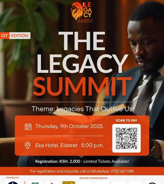 The Legacy Summit: Eka Hotel ,Eldoret, 9th October, 5 pm. Join visionary men for an exclusive gathering on legacy, wealth, succession, and leadership. 0791 478090