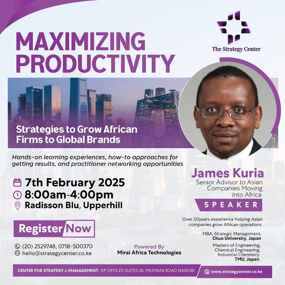 Strategies to Grow African Firms to Global Brands: Radisson Blu Hotel, 7th February, 8 am. Discover how to transform your business by learning from Asia’s meteoric rise. 0718 500370