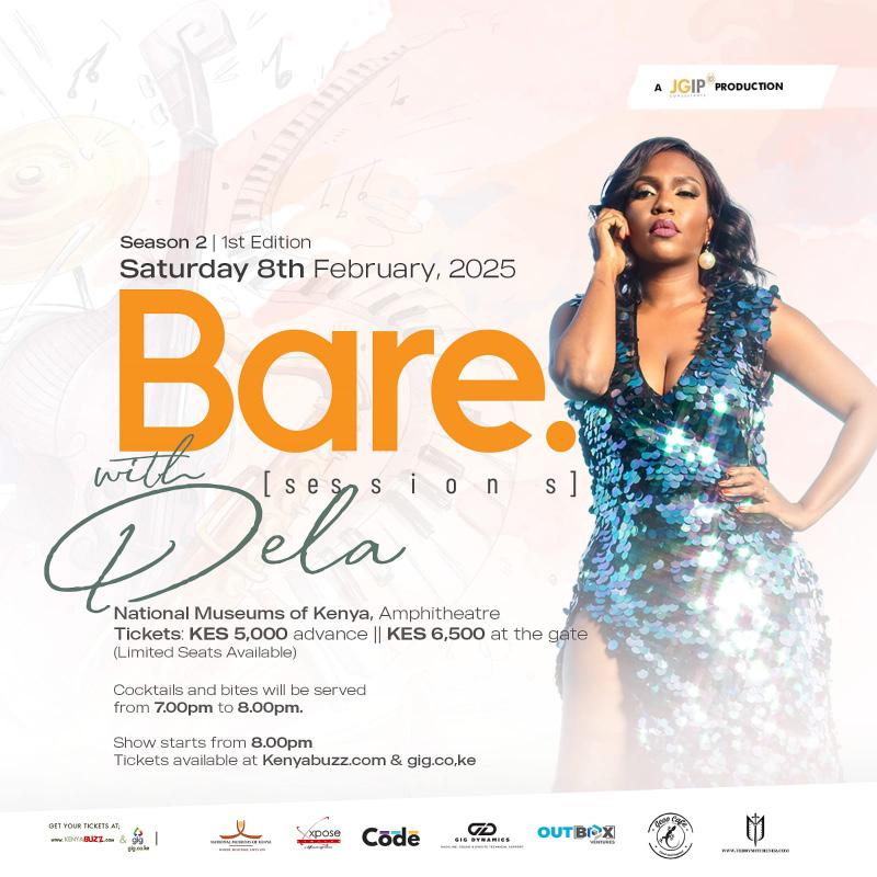 Bare Sessions with Dela: National Museums of Kenya, 8th February, 7 pm. Prepare for a reimagined experience of Dela’s edgy, soulful blend of Afro, Neo-Soul, Reggae, and Hip-hop. 0791 478090