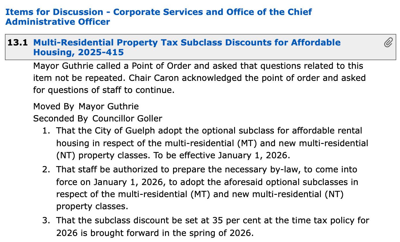 In September, we approved a new property tax discount program to encourage more affordable rental housing in Guelph. Starting January 1, 2026, multi-residential properties that provide units meeting the Province’s definition of “affordable residential unit,” and that are regulated by agreements with federal, provincial, or municipal bodies, will be eligible for a 35% reduction on the municipal portion of property taxes.