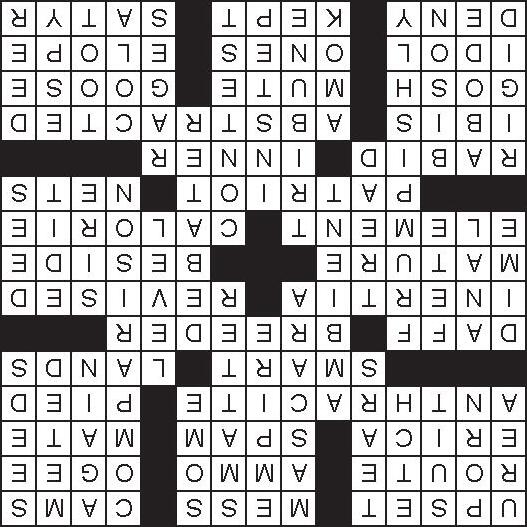 1.Discomfit 6.Clutter 10.Rotating disks 14.Itinerary 15.Ammunition 16.Curved molding 17.Genus of heath 18.Junk E-mail 19.Companion 20.Hard coal 22.Multicolored 23.Brainy 24.Territories 25.Cast aside (archaic) 29.Stud farm operator 31.Disinclination to motion 33.Amended 37.Grow older 38.Next to 39.Primary chemical 41.Unit of food energy 42.Nationalist 44.Trawling equipment 45.Fanatical 48.Not outer 50.Nile bird 51.Absentminded 56.Golly 57.Silence 58.Long-necked migratory bird 59.False god 60.1 1 1 1 1.Fertilizer component 2.Erotica 3.A set of garments 4.Carve in stone 5.Rips 6.Eye makeup 7.Like a kingdom DOWN ACROSS Copyright www.mirroreyes.com Solution