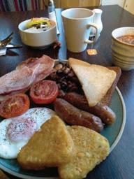 Number of calories in a modest “English breakfast,” consisting of one fried egg, two slices of bacon, two sausages, ½ tin of baked beans, two grilled tomatoes, two portions of “fried bread,” two portions of hash browns and one portion of fried mushrooms. I ate this for three days straight, and I lived to tell the tale — so far.
